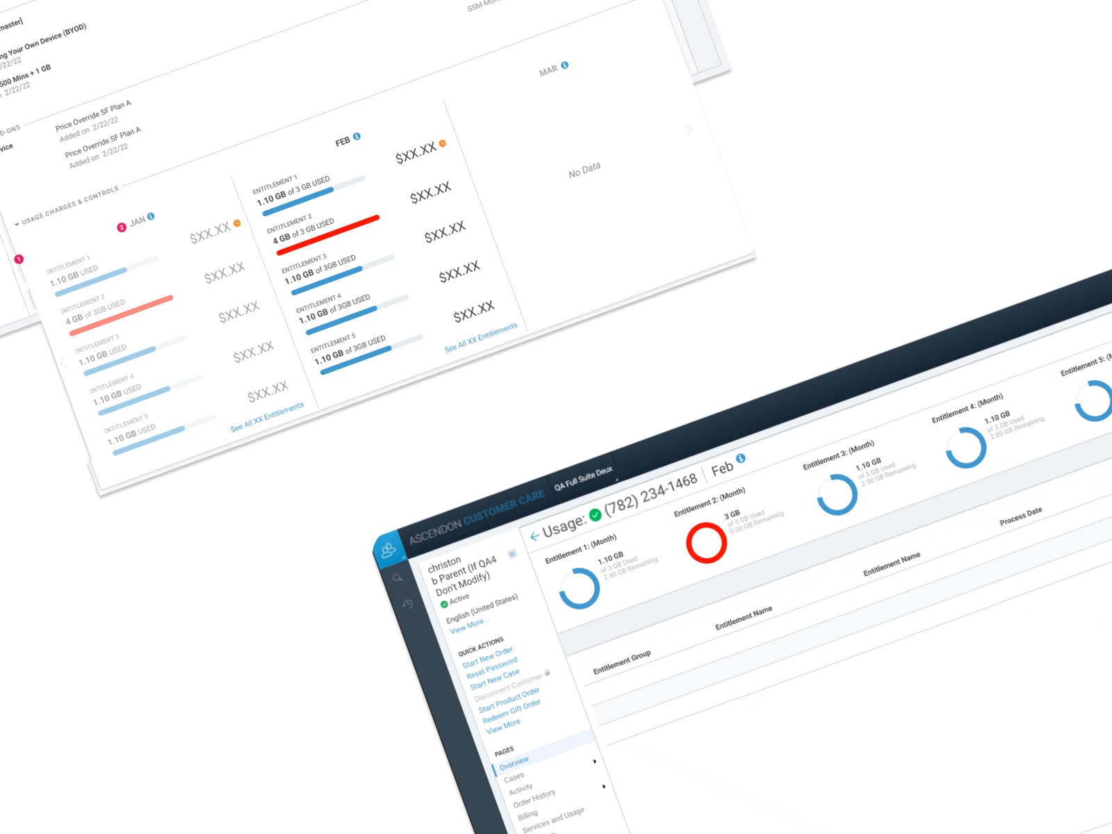 Ascendon’s CSR portal has a series of pages for managing each client customer. The customer dashboard is the main hub and hosts widgets for previewing and resolving issues related to customer usage charges.